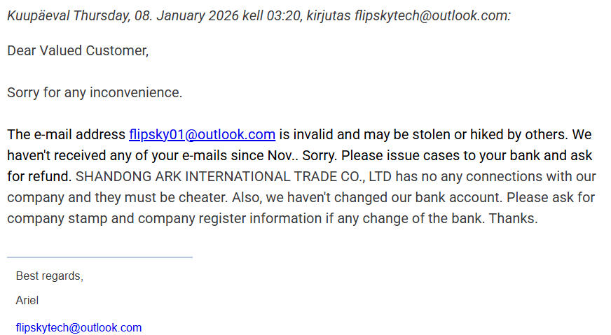 (Later we also checked the address listed on the website — it turned out to be a virtual office.)2. However, the first invoice listed the company as Guangdong Flipsky Technology Company Limited.3. The following invoices then came from SHANDONG ARK INTERNATIONAL TRADE CO., LTD.A similar rotation happens with the email addresses used to reply: