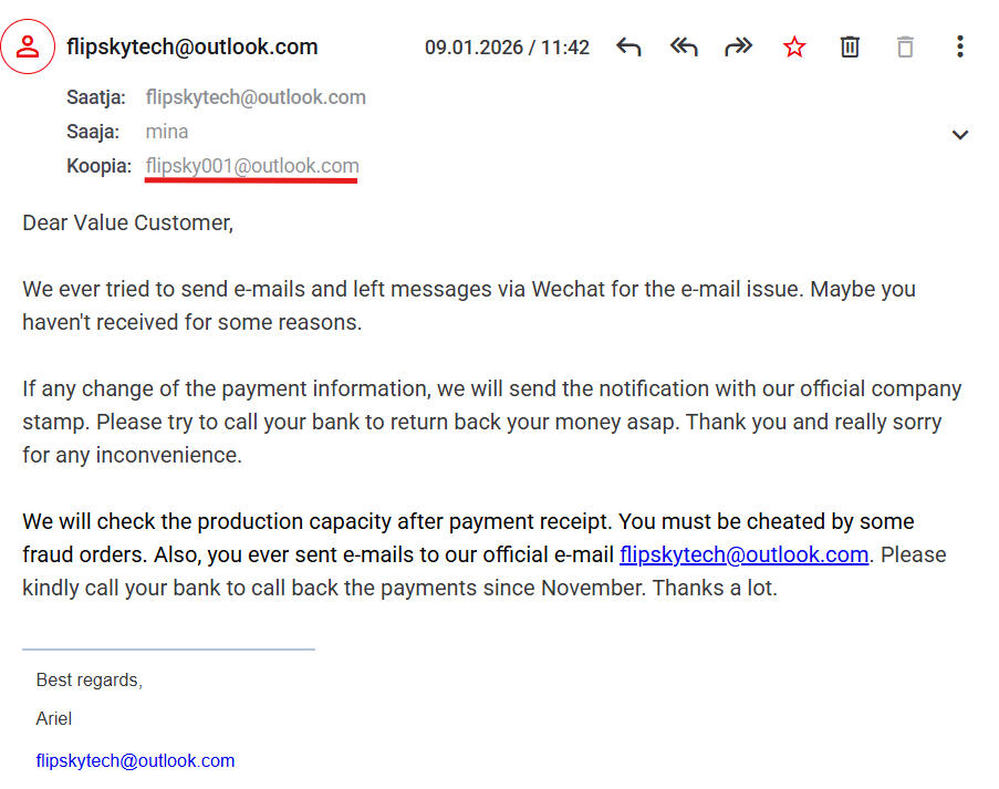 Flipsky’s behaviour does not resemble that of an honest company which, upon discovering a security issue on its own side, would act properly:1. It would immediately inform all affected parties — which is also a legal requirement — to prevent further damage.2. If damage had already occurred, it would take responsibility (inlcuding financial responsibility), since the security issue originated on its side.3. It would contact the police.Flipsky did none of this, which is yet another indication that Flipsky is not a victim but an active participant in the scheme. Posting a ‘warning’ on social media months later appears more like a strategy of ‘steal enough first, then create the illusion of innocence’.